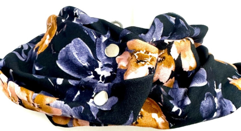 Et flot tørklæde i en mørkeblå med blade og blomster i lila, beige og camelfarver. Tørklædet beskytter tøjet for våde pletter og camouflere samtidig yderst effektivt. Flot og stilfuldt.