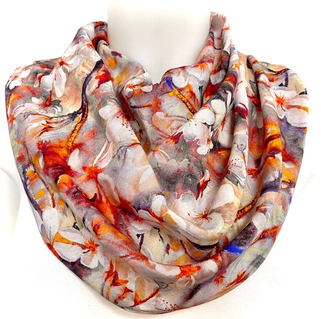 Smukt forårstørklædeSMUKT TøRKLæDE I BRæNDTE FARVER. Dette smukke tørklæde er i et blomsterdesign i brændte efterårsfarver. Tørklædet har fastsatte folder, der får det til altid at falde smukt uden man skal gøre noget.